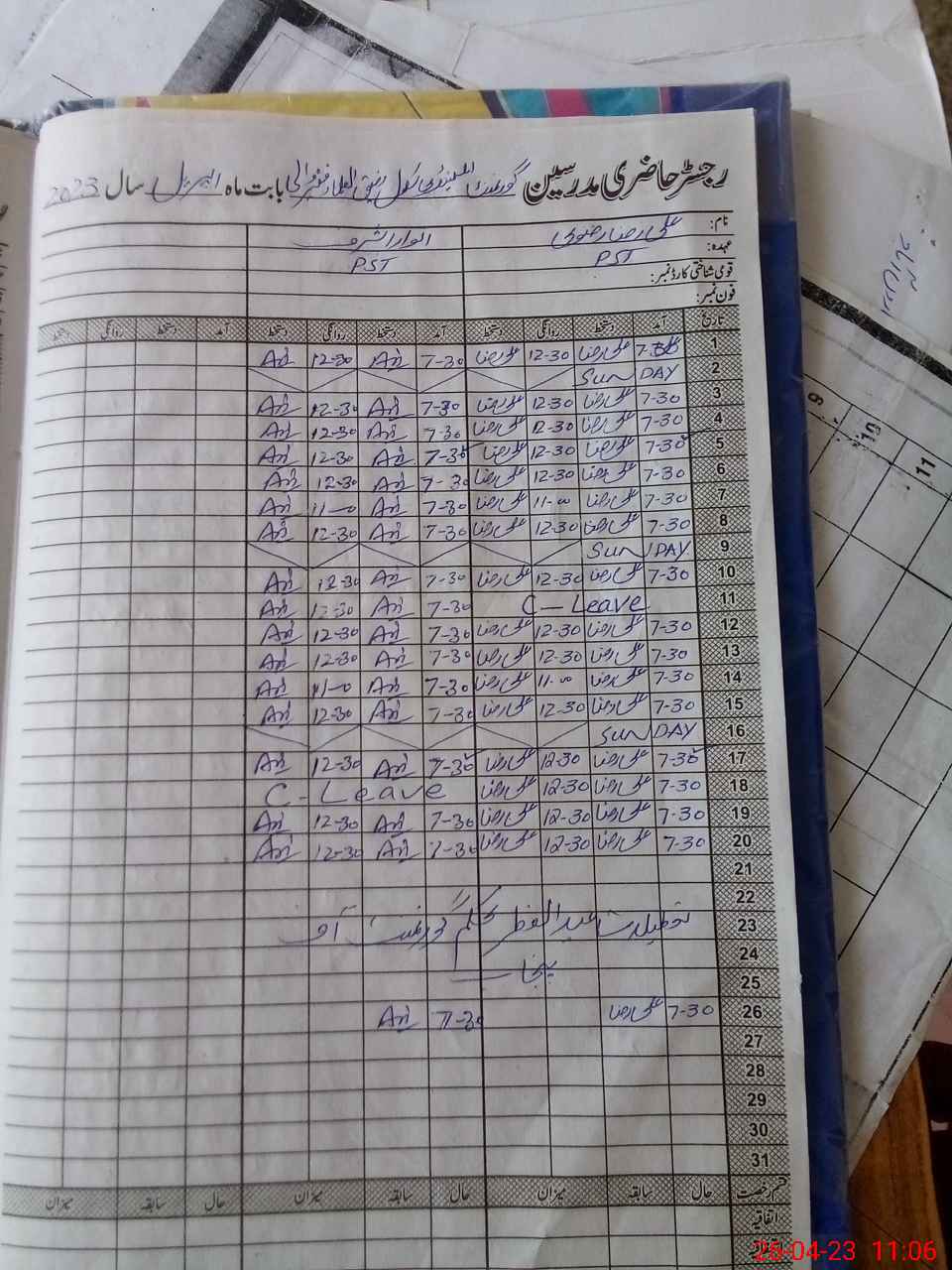 | Name: An**** As**** Designation: (School Headmaster's/Headmistress's) PST Phone/Cell Number: 03**** |