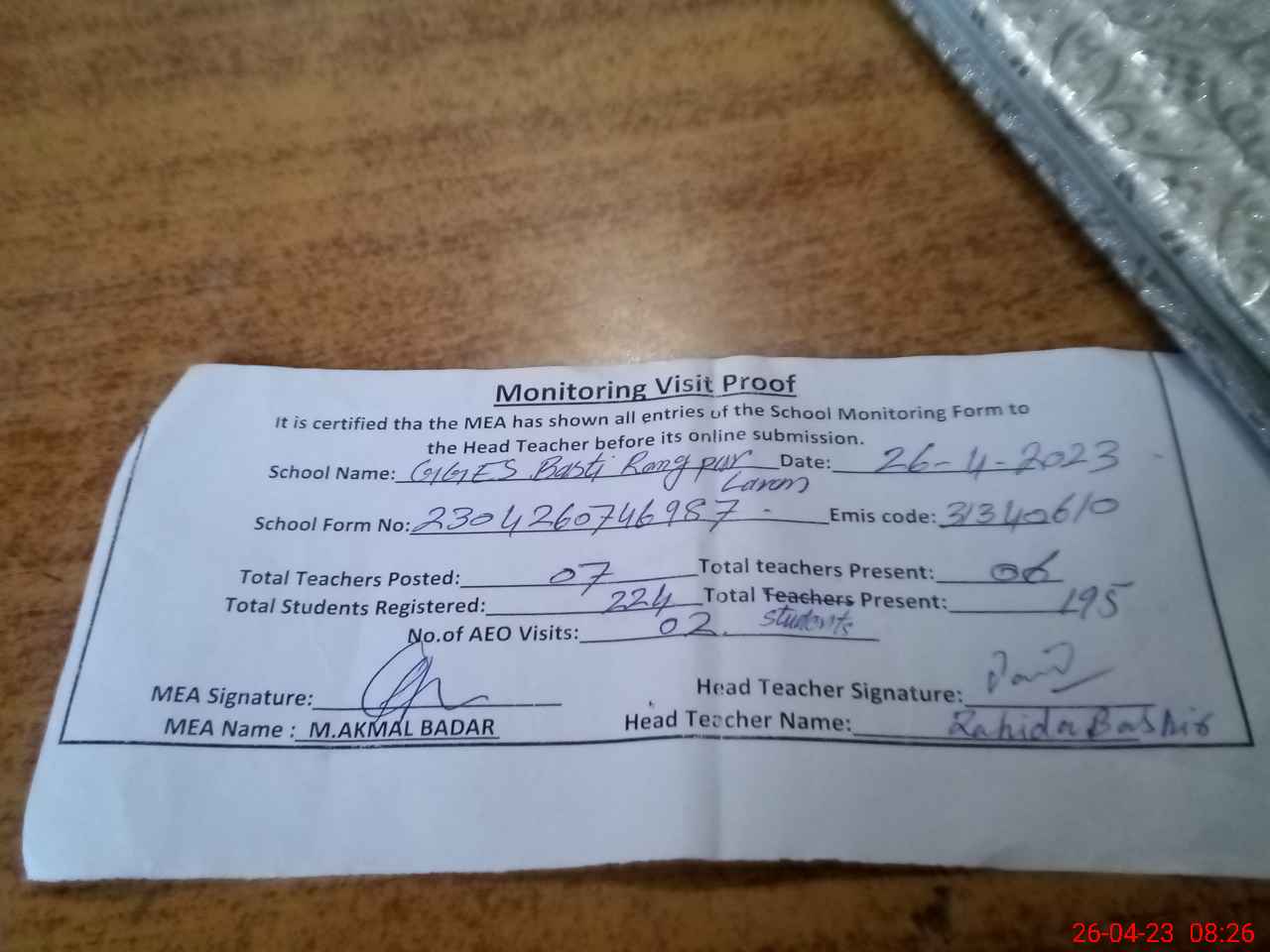 | EMIS Code: 31340610 | Name of School: GGES BASTI RANG PUR LARAN | |||