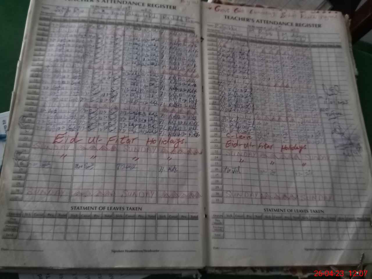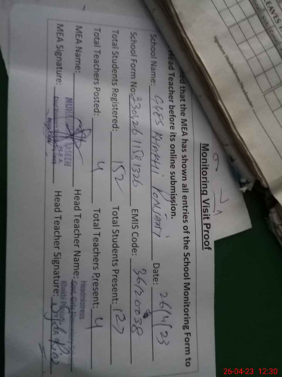 | Attendance Register | Head Teacher | MEA with School | Visit Proof |