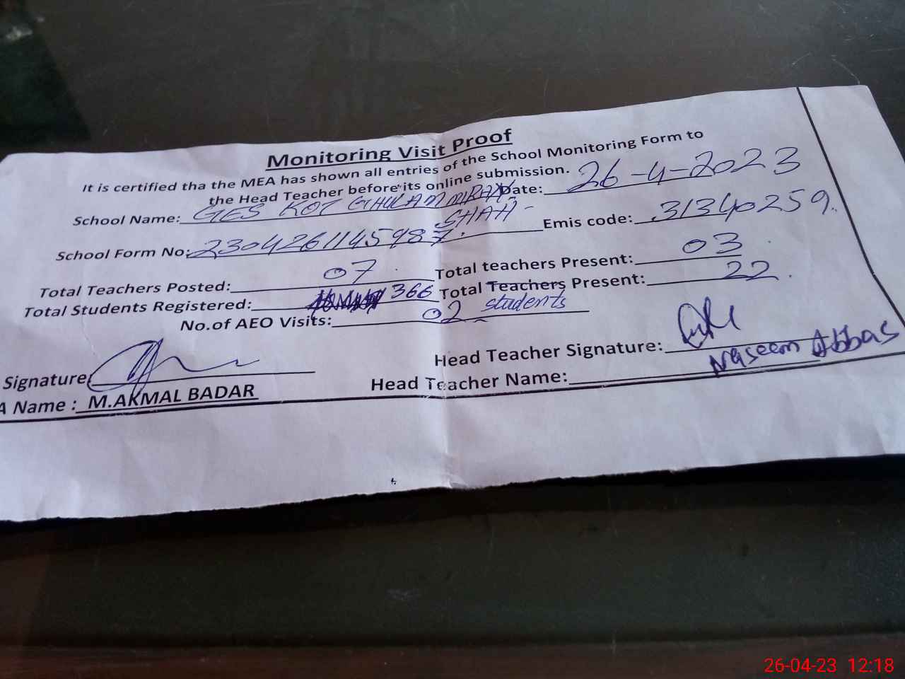 | Attendance Register | Head Teacher | MEA with School | Visit Proof |