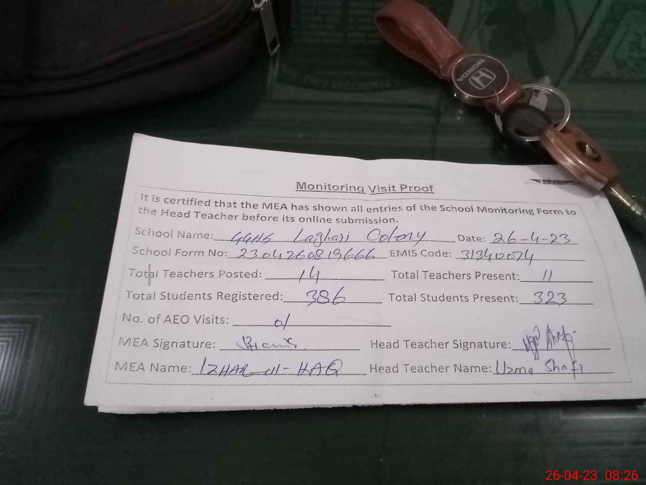 | Monitoring Date: 26-04-2023 | Start Time: 26-04-2023 07:49 AM | End Time: 26-04-2023 08:31 AM | Name of MEA: Mu**** Iz**** UlHa**** | |