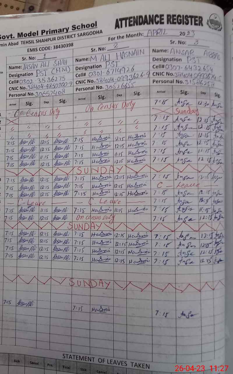 | CNIC | Full Name | Designation | R/C | Absence During Last Calender Month |