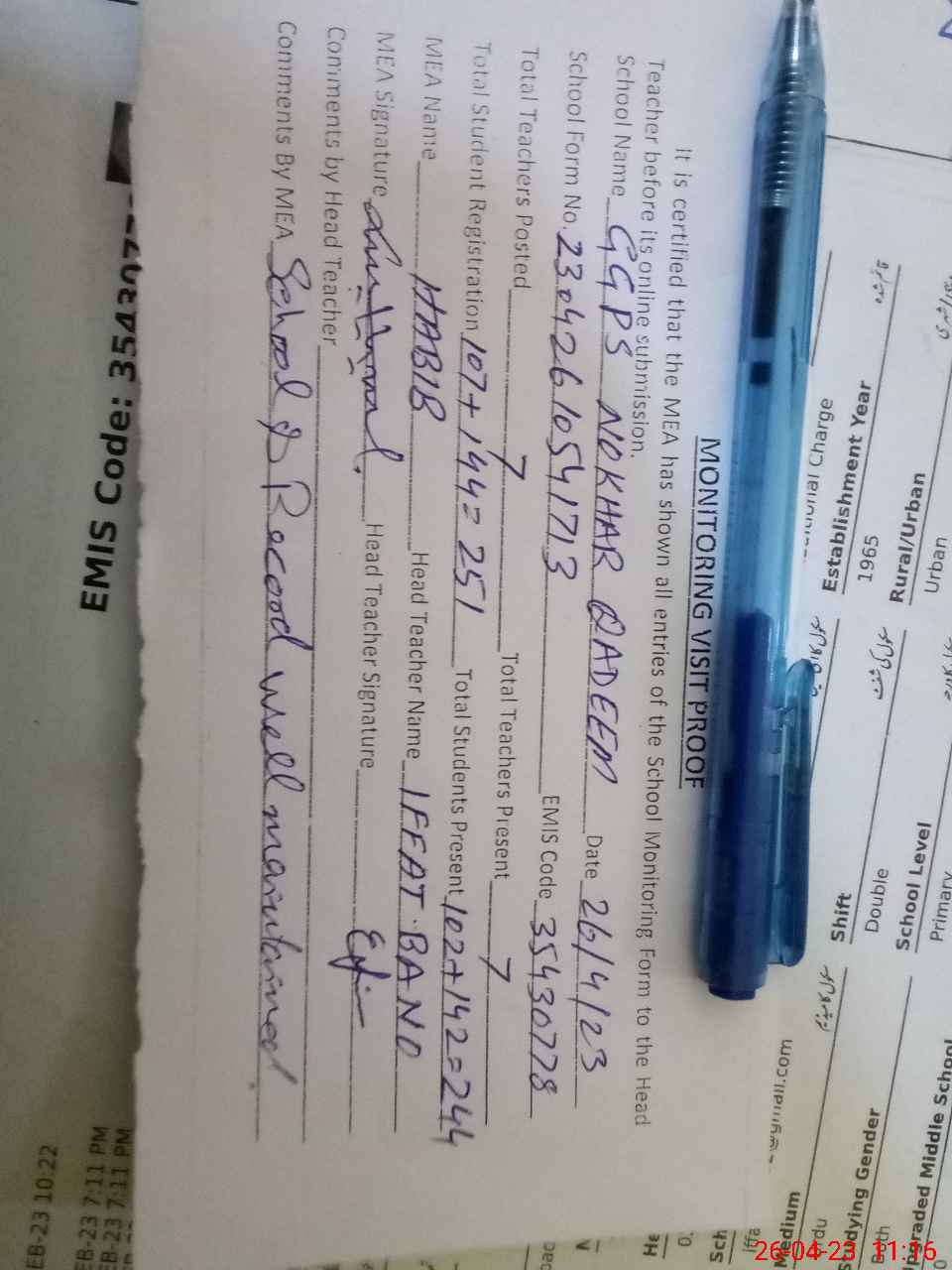 | Attendance Register | Head Teacher | MEA with School | Visit Proof |