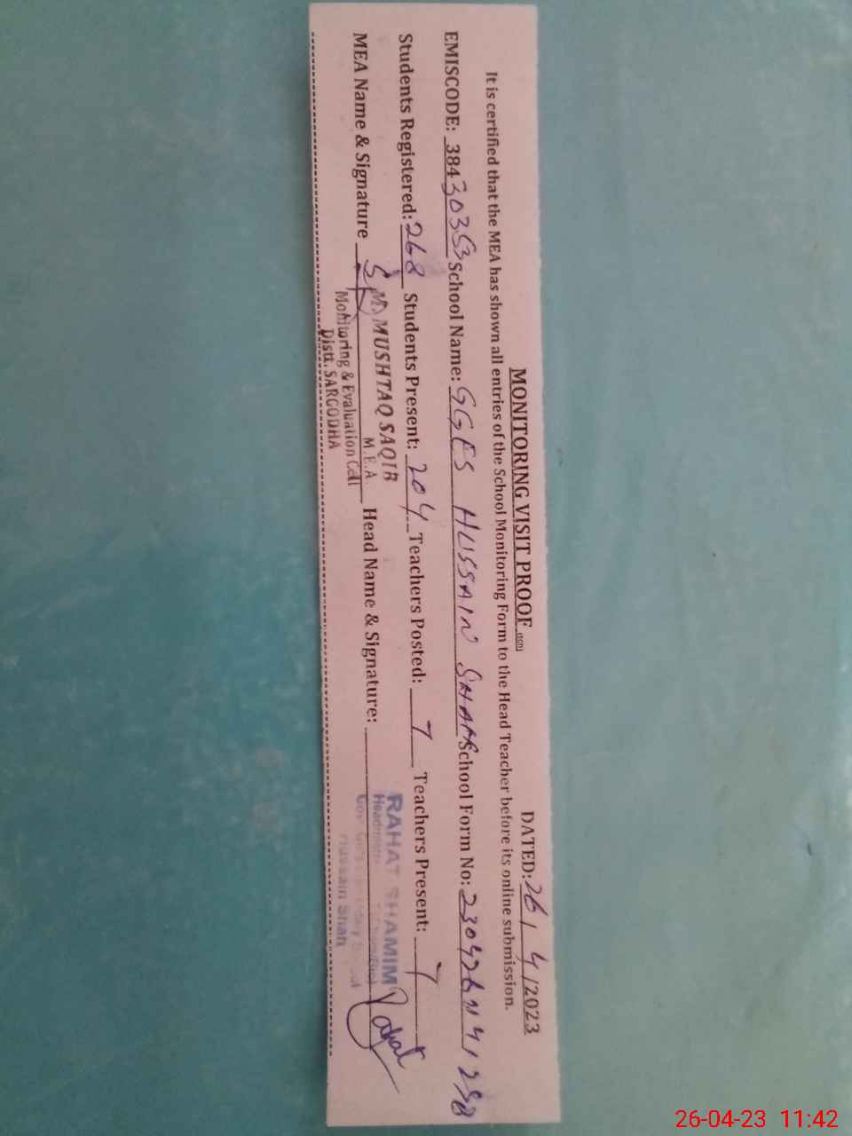 | Attendance Register | Head Teacher | MEA with School | Visit Proof |