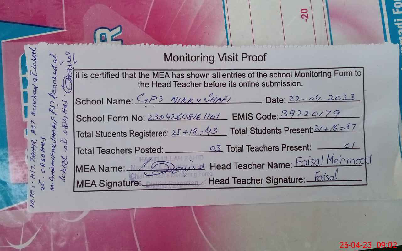 | EMIS Code: 39220179 | Name of School: GPS NIKKI SHAFI P/O SHAFI ARIFWALA | |||