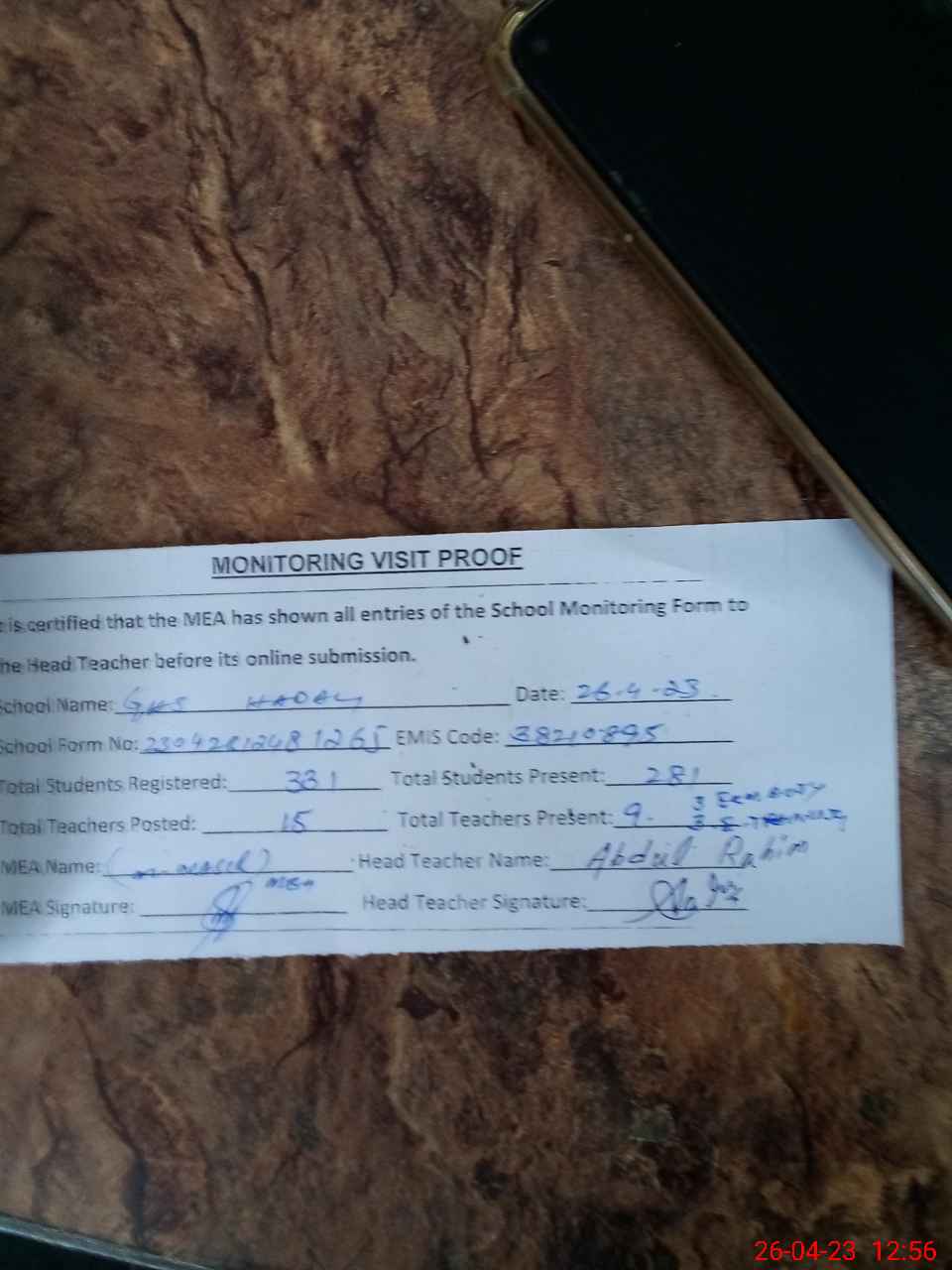 | EMIS Code: 38210895 | Name of School: GHS HADALI | |||