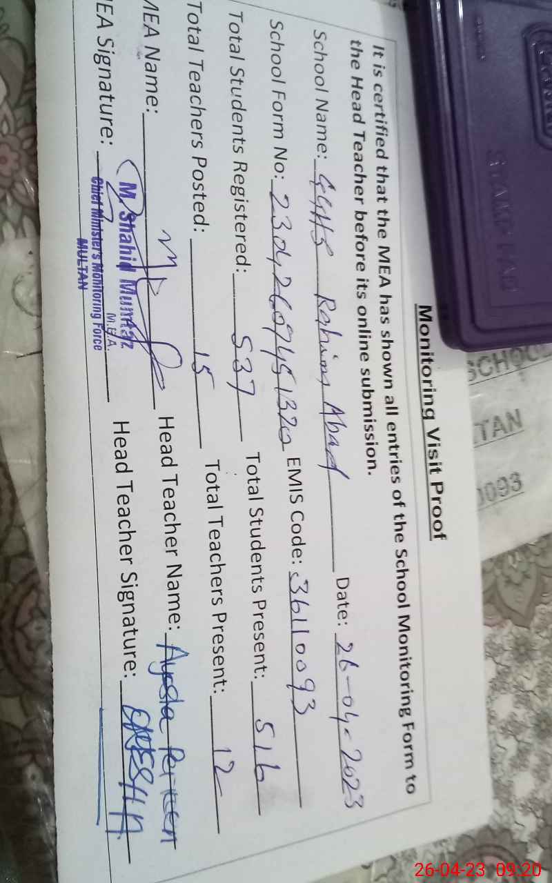 | EMIS Code: 36110093 | Name of School: GGHS MC RAHIM ABAD MULTAN | |||