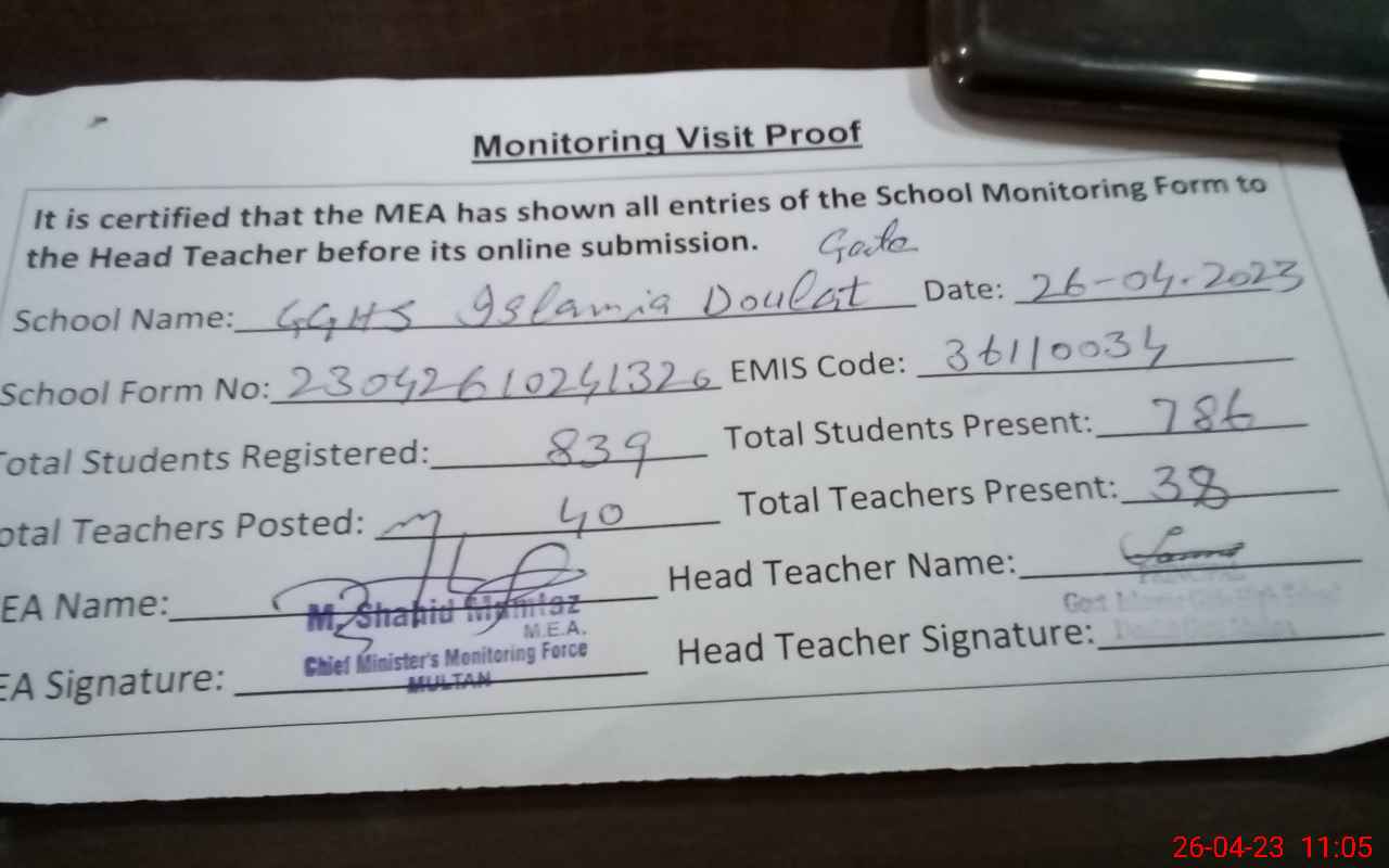| EMIS Code: 36110034 | Name of School: GGHS ISLAMIA DOULAT GATE MULTAN | |||
