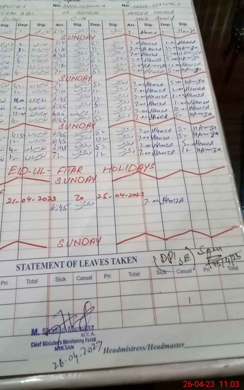 | CNIC | Full Name | Designation | R/C | Absence During Last Calender Month |