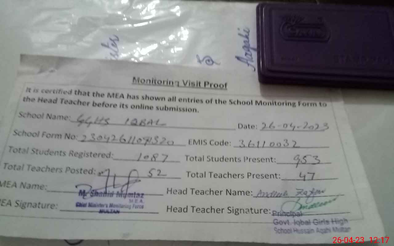 | EMIS Code: 36110032 | Name of School: GGHS IQBAL HUSSAIN AGAHI ROAD MULTAN | |||
