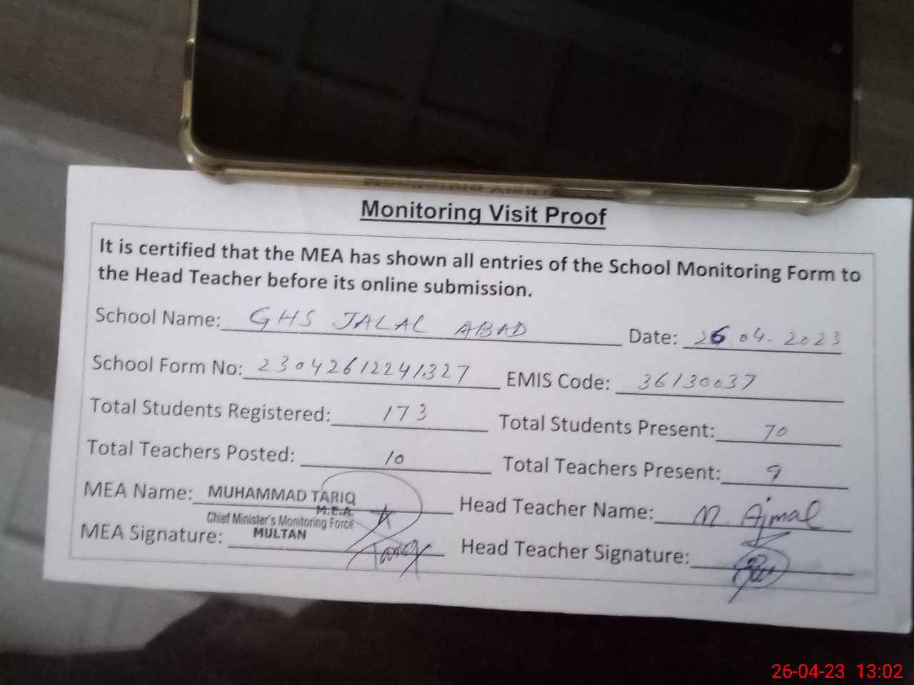 | EMIS Code: 36130037 | Name of School: GHS JALAL ABAD SHUMALI MULTAN | |||
