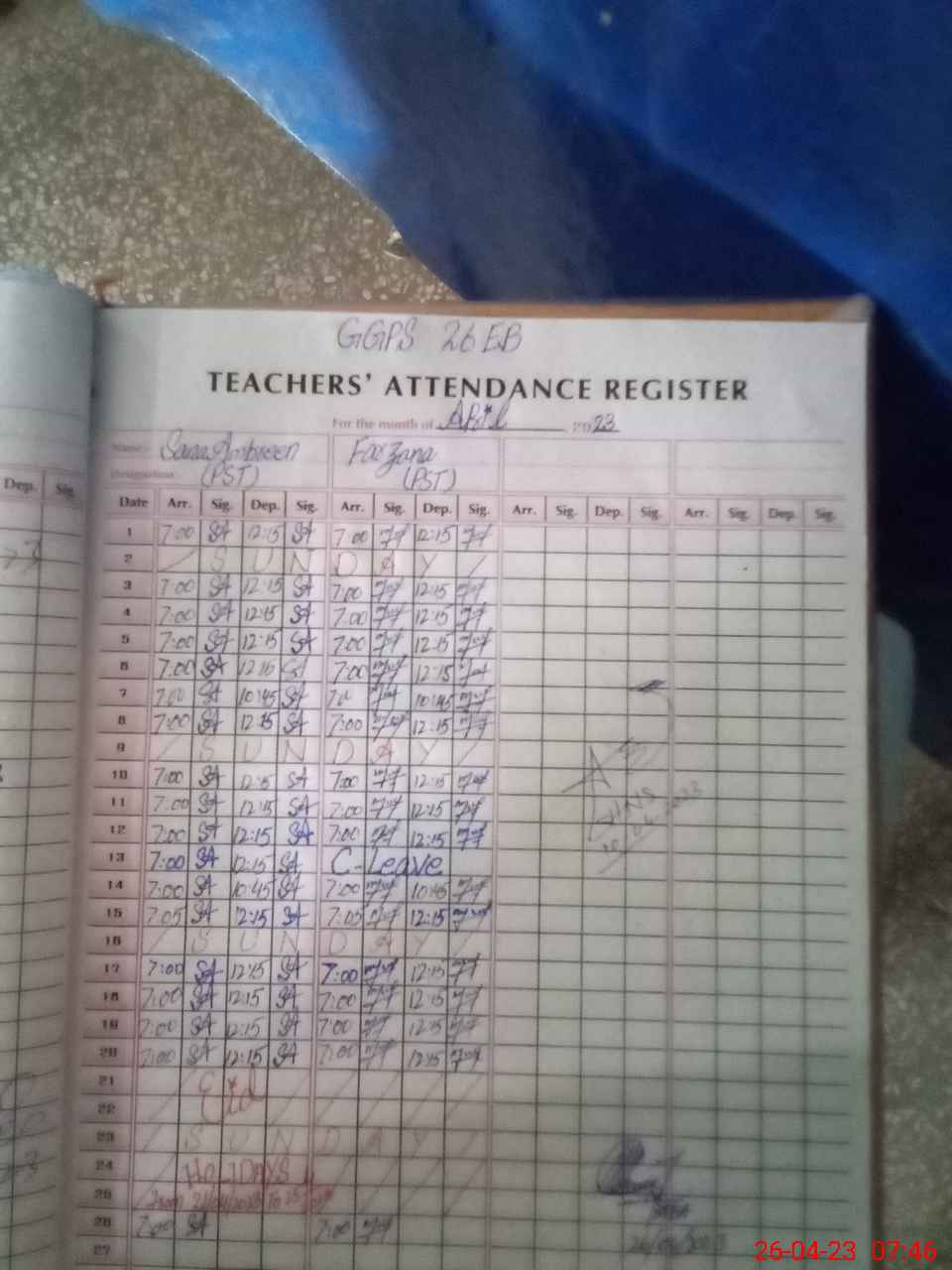 | Monitoring Date: 26-04-2023 | Start Time: 26-04-2023 07:44 AM | End Time: 26-04-2023 08:36 AM | Name of MEA: Mu**** Ab**** | |