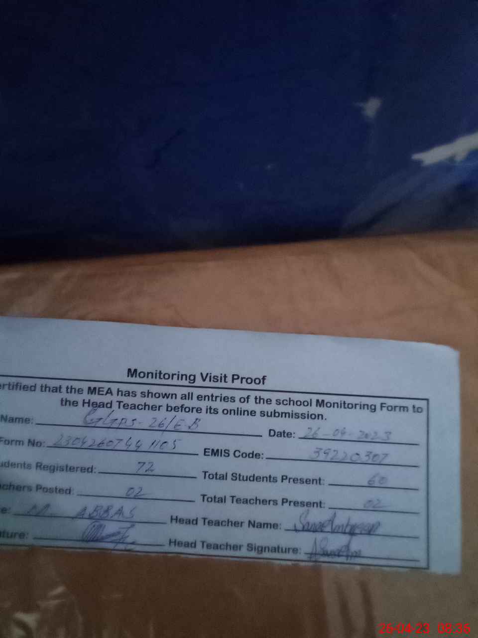 | Attendance Register | Head Teacher | MEA with School | Visit Proof |