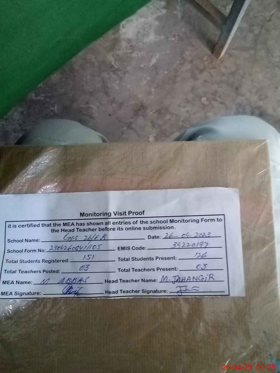 | Attendance Register | Head Teacher | MEA with School | Visit Proof |