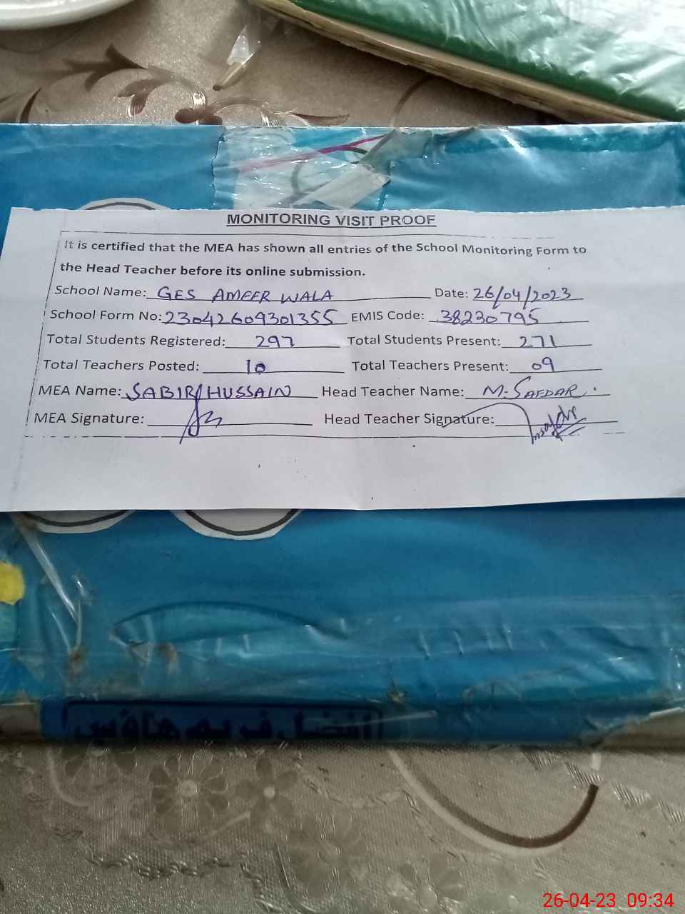 | Attendance Register | Head Teacher | MEA with School | Visit Proof |