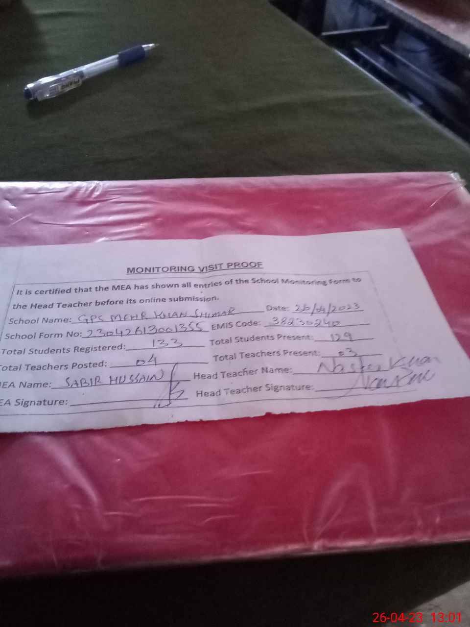 | EMIS Code: 38230240 | Name of School: GPS MEHR KHAN SHIMAR | |||