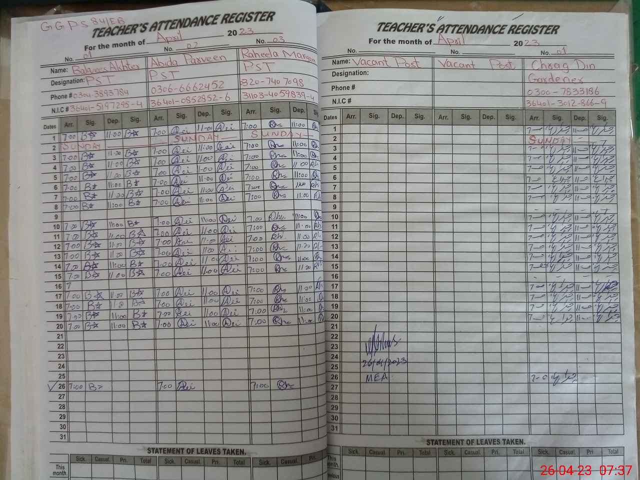 | Name: BA**** AK**** Designation: (School Headmaster's/Headmistress's) PST Phone/Cell Number: 03**** |