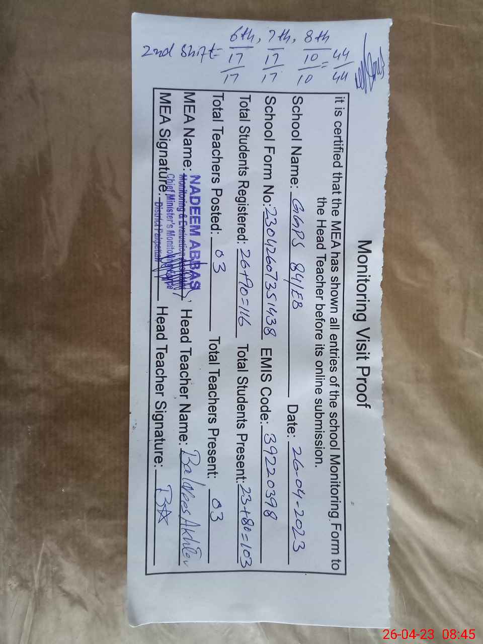 | Attendance Register | Head Teacher | MEA with School | Visit Proof |