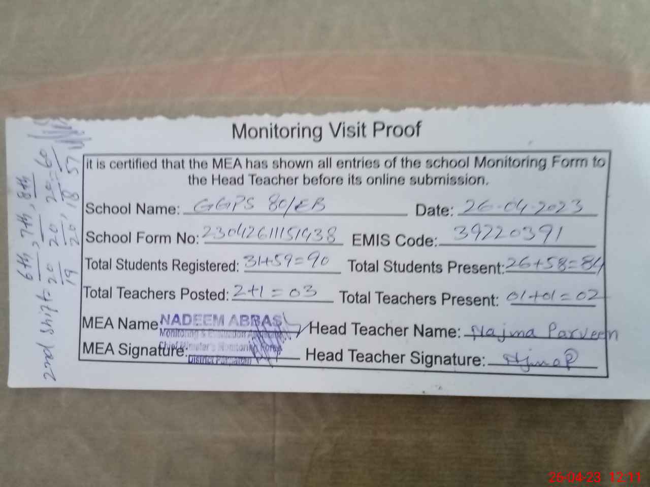 | Attendance Register | Head Teacher | MEA with School | Visit Proof |