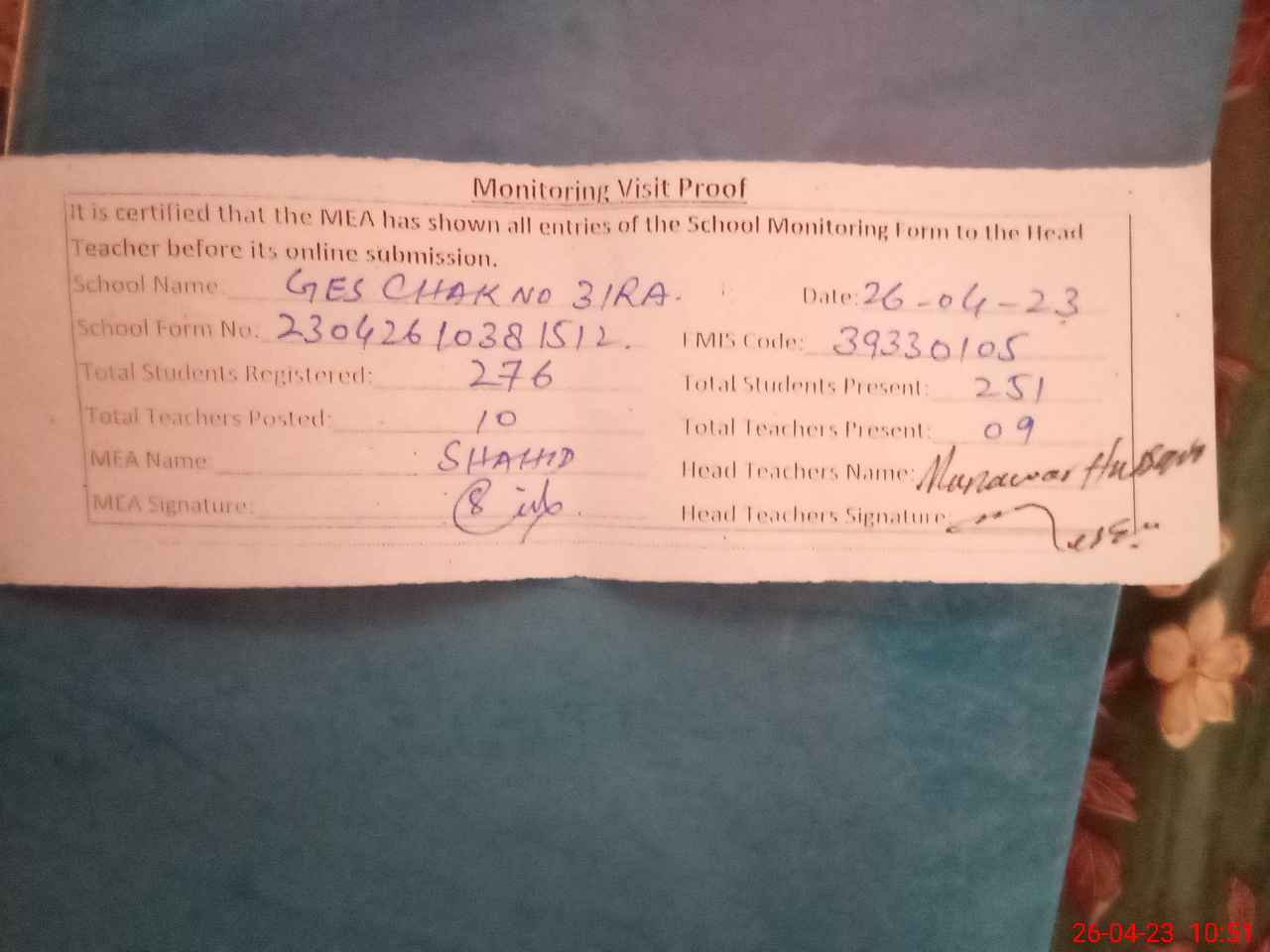 | EMIS Code: 39330105 | Name of School: GES CHAK NO. 3/1-RA | |||
