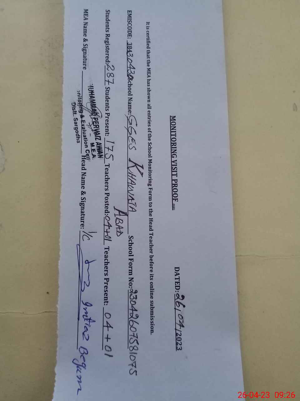| Attendance Register | Head Teacher | MEA with School | Visit Proof |