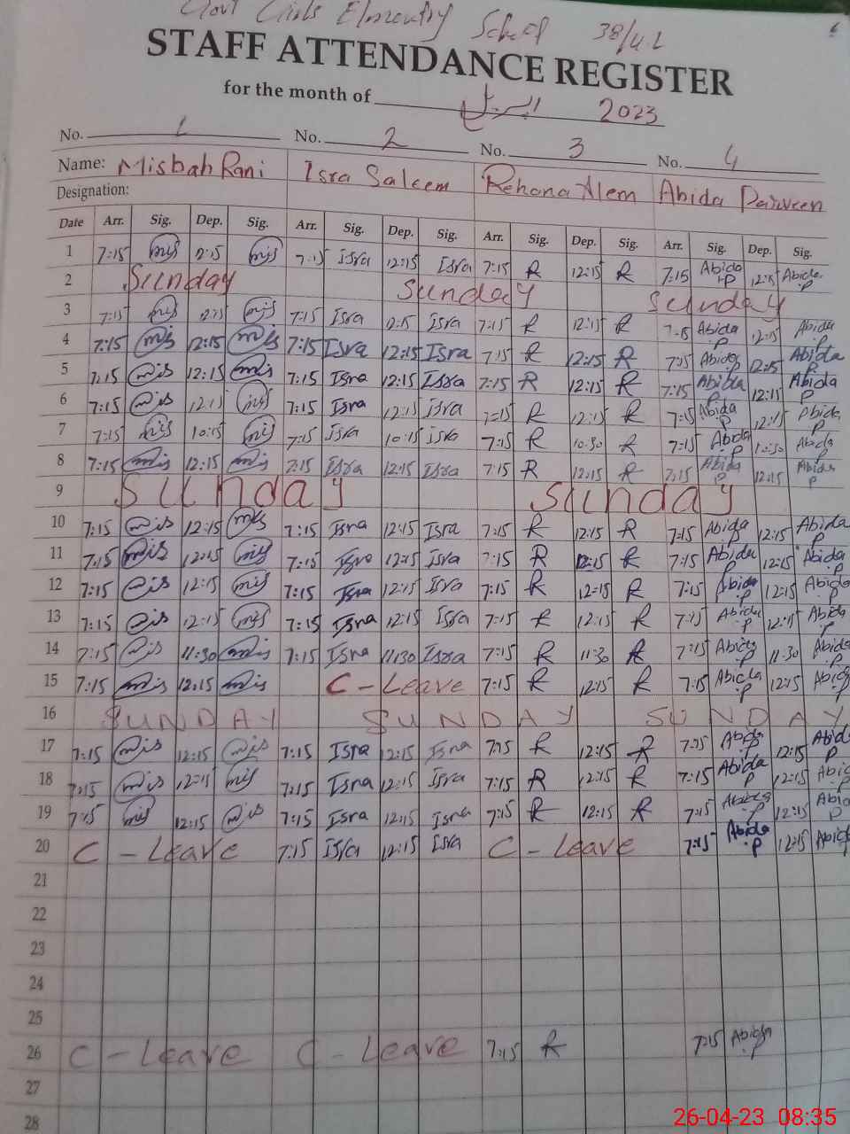 | CNIC | Full Name | Designation | R/C | Absence During Last Calender Month |