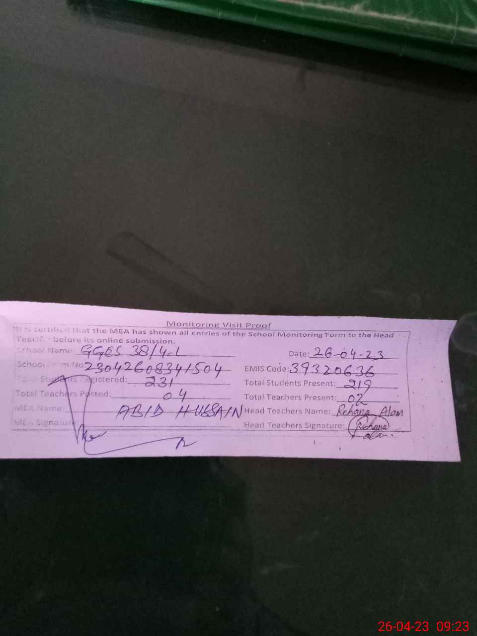| Attendance Register | Head Teacher | MEA with School | Visit Proof |