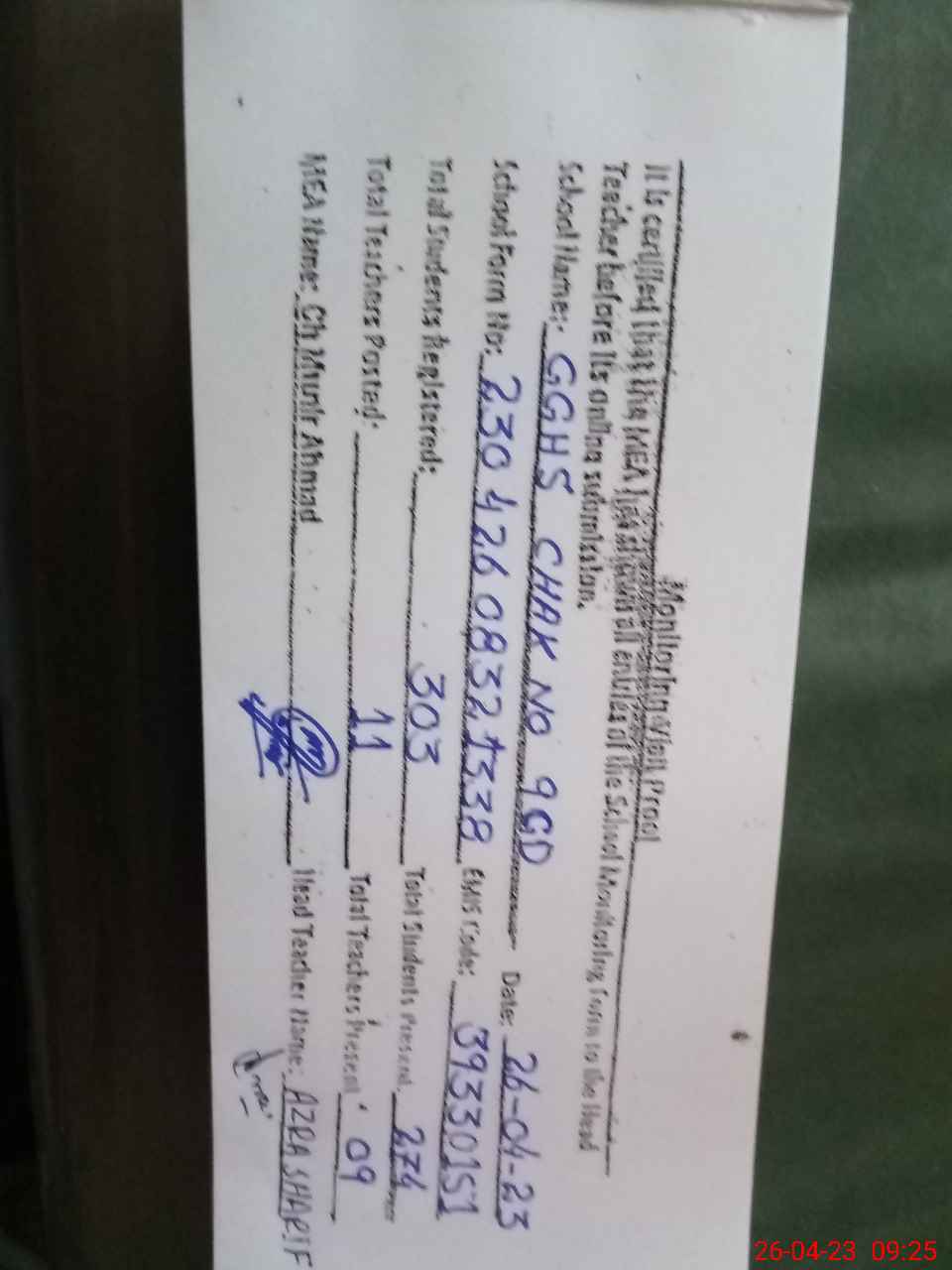 | EMIS Code: 39330151 | Name of School: GGHS CHAK NO.9/GD | |||