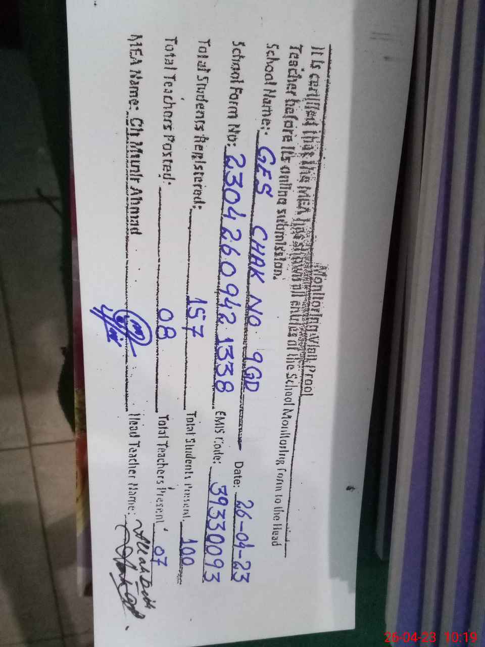 | Name: Mu**** Sa**** Designation: (School Headmaster's/Headmistress's) EST At Phone/Cell Number: 03**** |