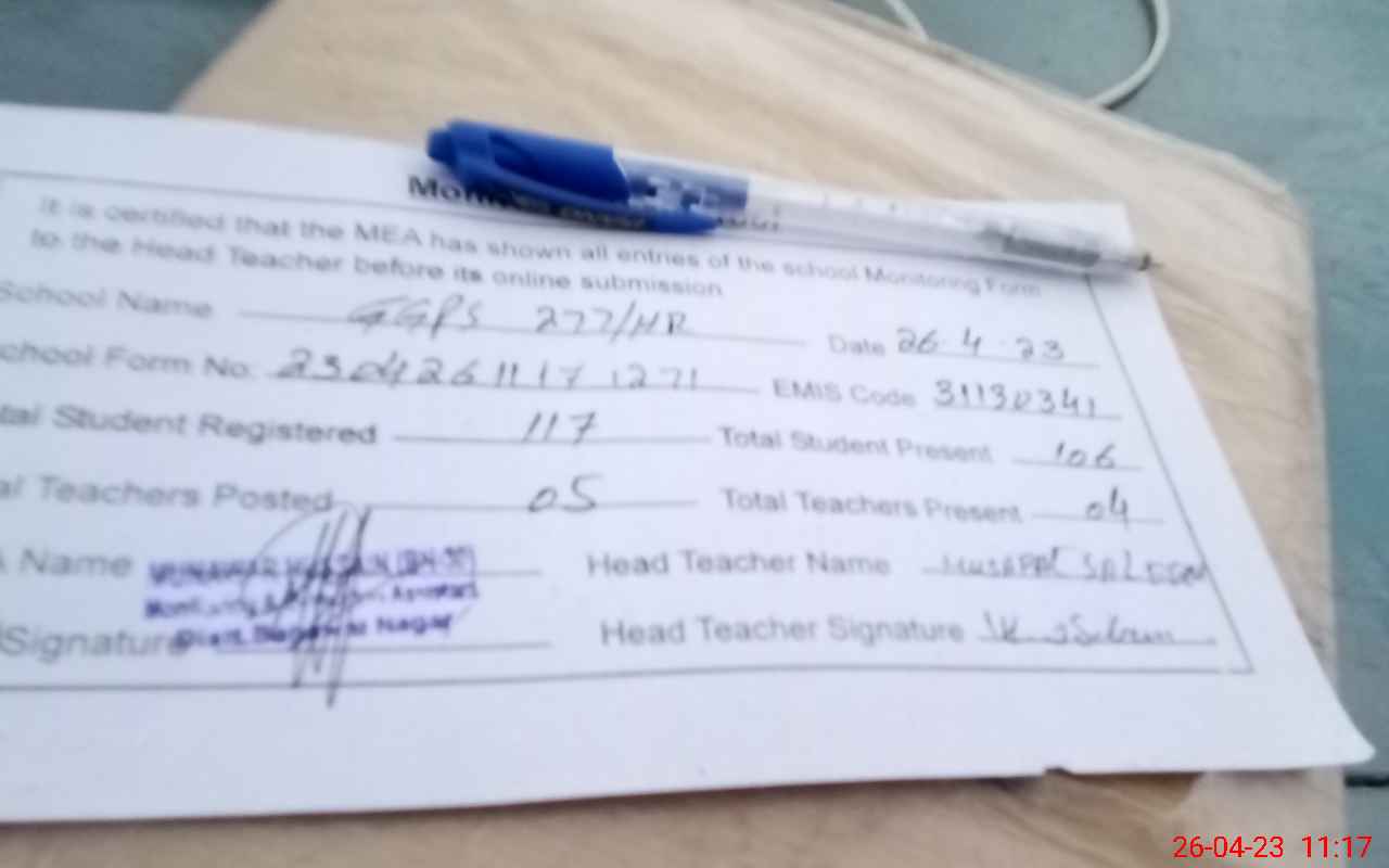 | EMIS Code: 31130341 | Name of School: GMPS CHAK NO 277 HR W | |||