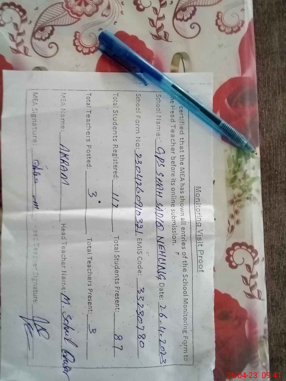 | Attendance Register | Head Teacher | MEA with School | Visit Proof |