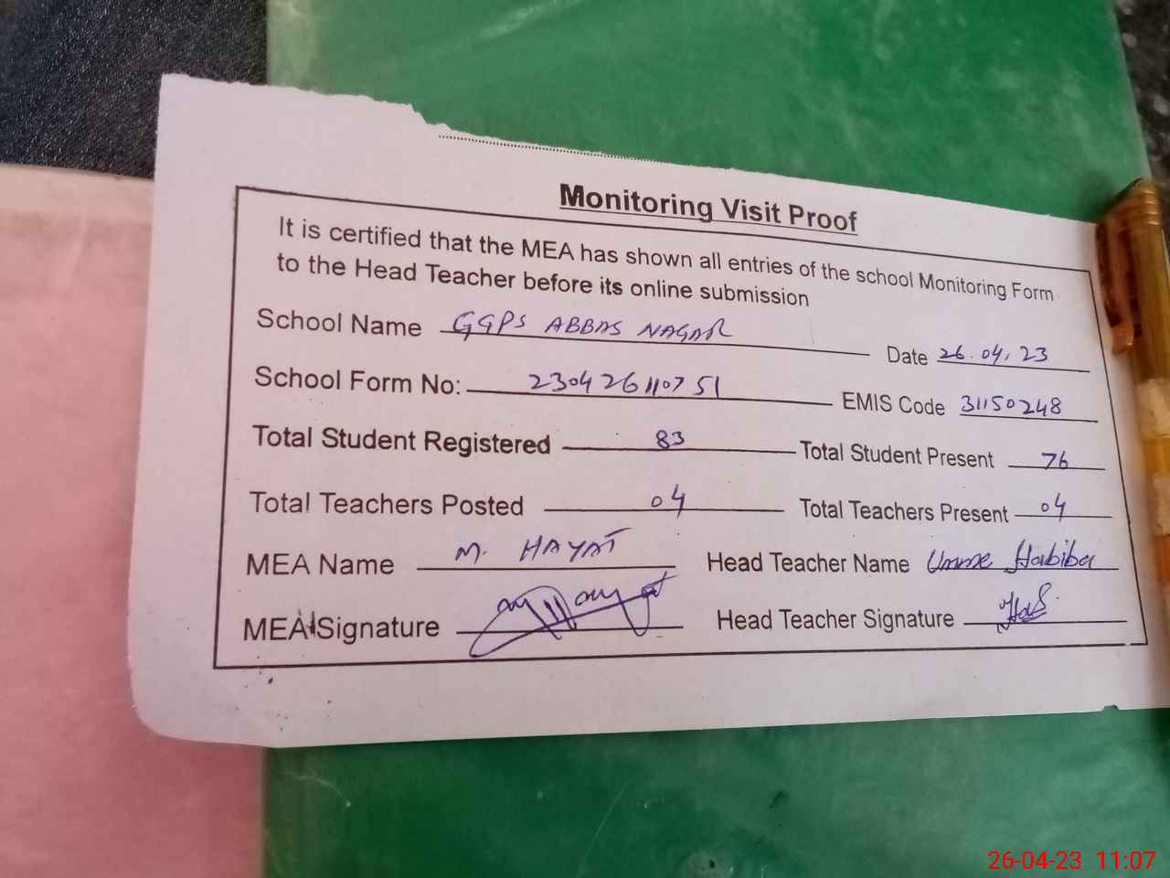 | EMIS Code: 31150248 | Name of School: GGPS ABBAS NAGAR | |||