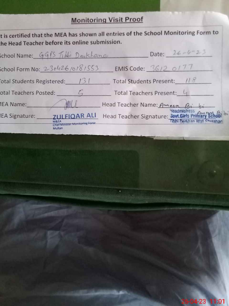 | EMIS Code: 36120177 | Name of School: GGPS TIBBI DARKHAN WALA | |||