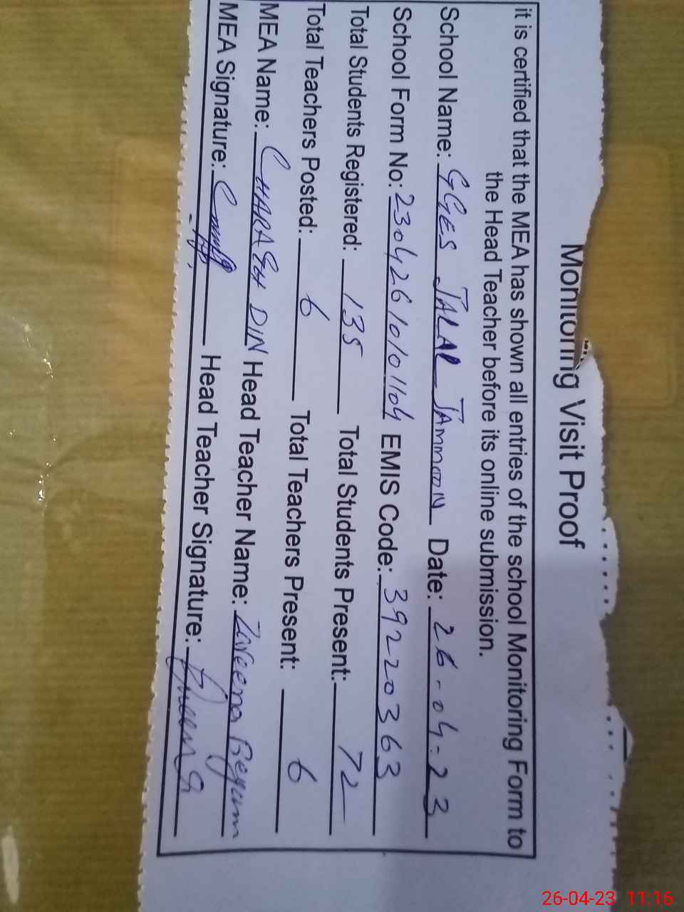 | Attendance Register | Head Teacher | MEA with School | Visit Proof |