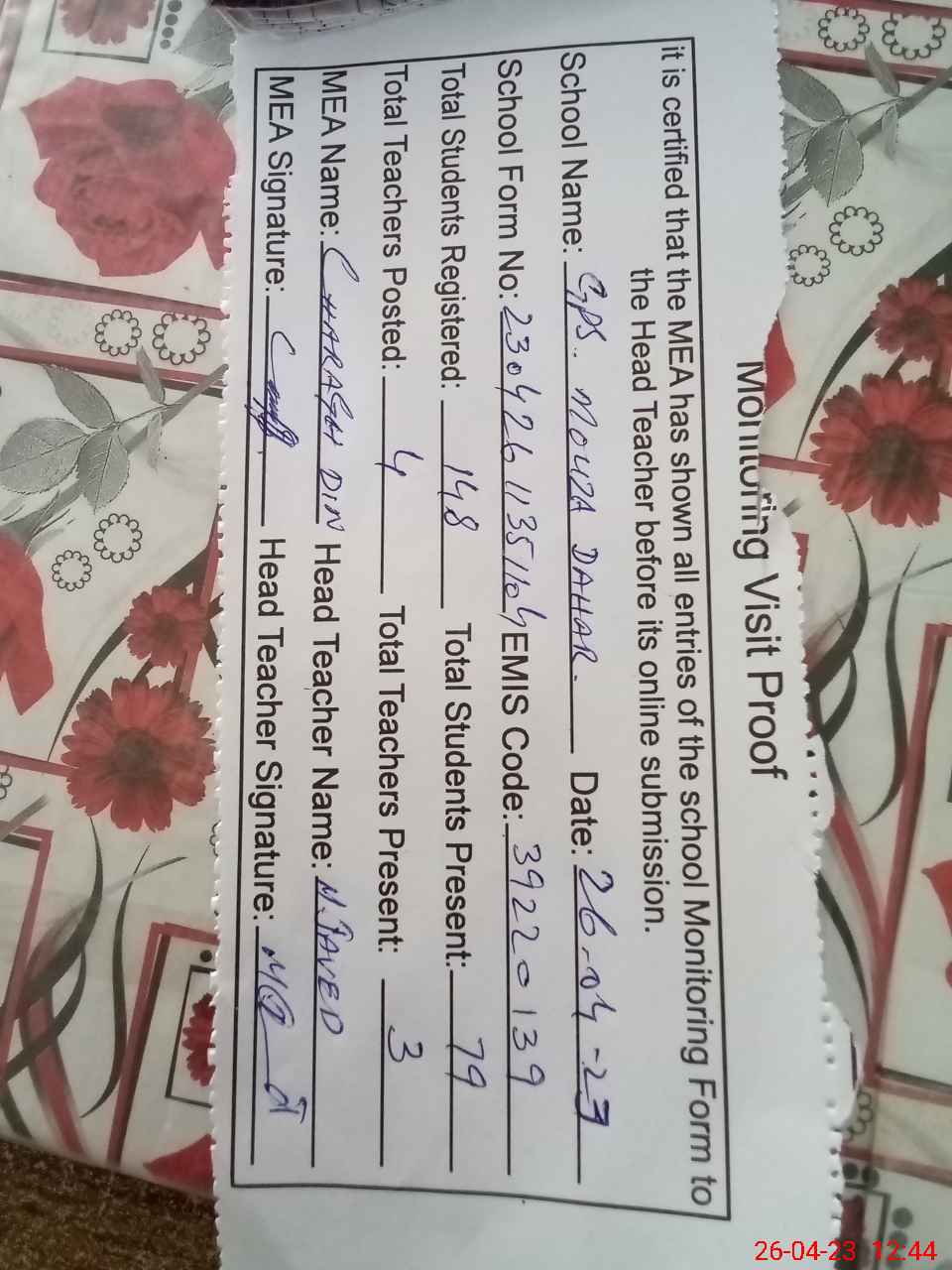 | Attendance Register | Head Teacher | MEA with School | Visit Proof |