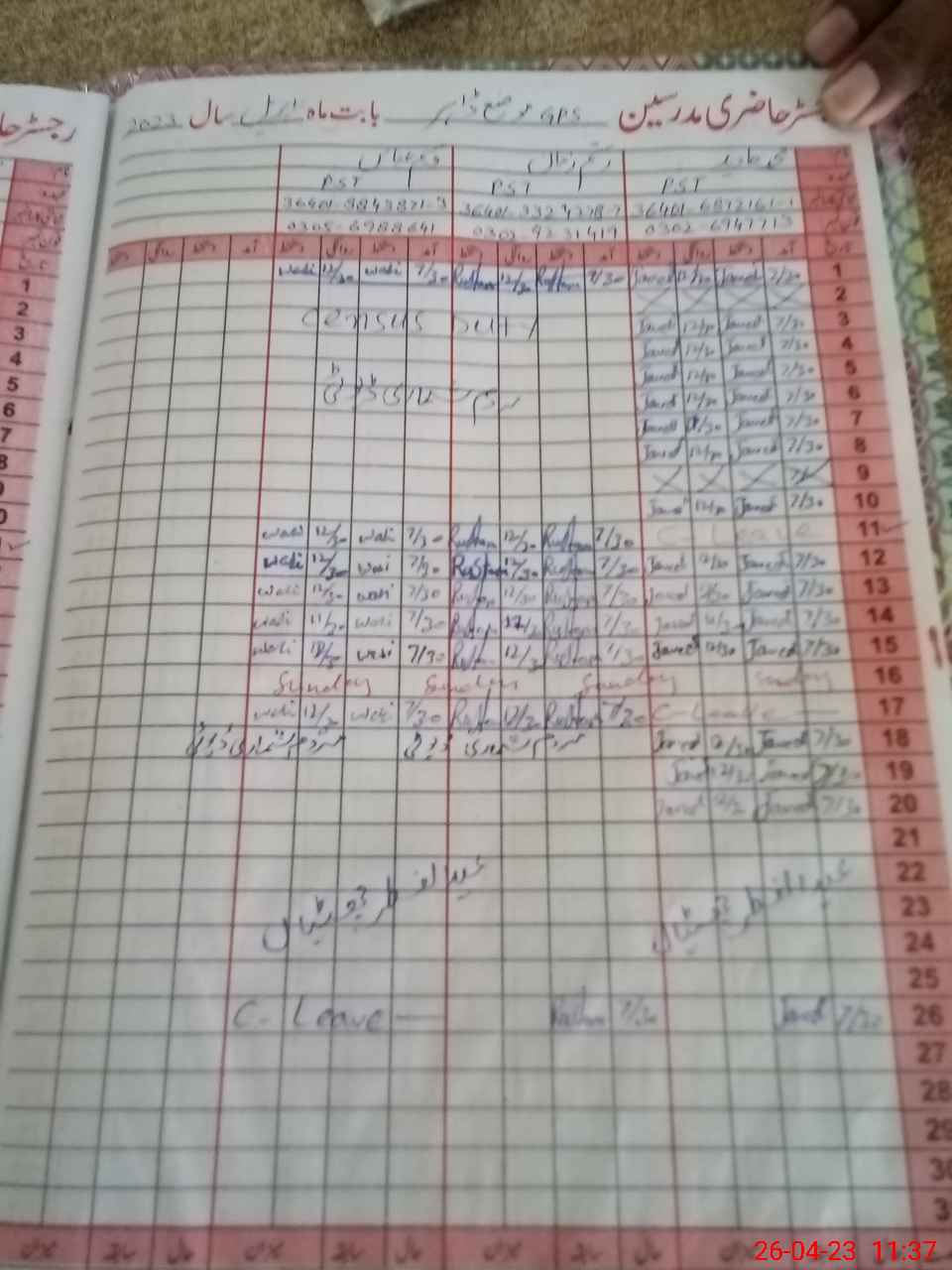 | CNIC | Full Name | Designation | R/C | Absence During Last Calender Month |