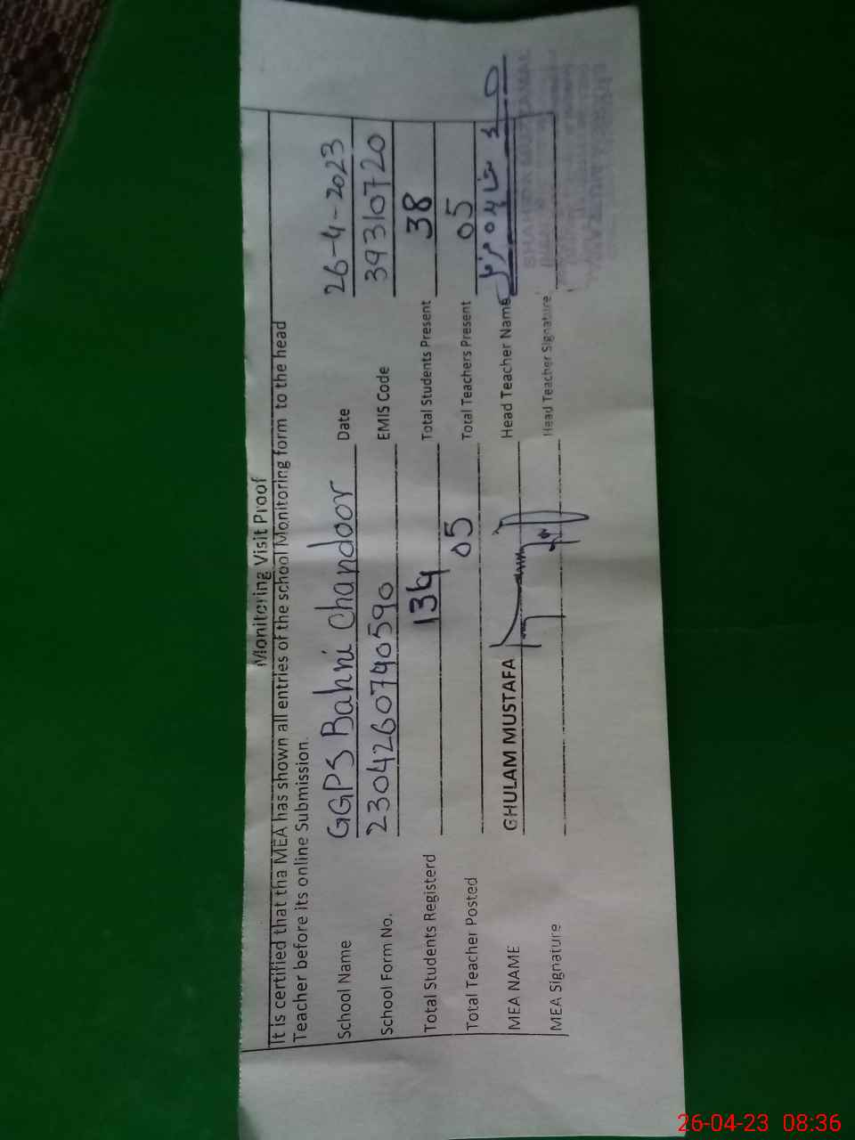 | Attendance Register | Head Teacher | MEA with School | Visit Proof |