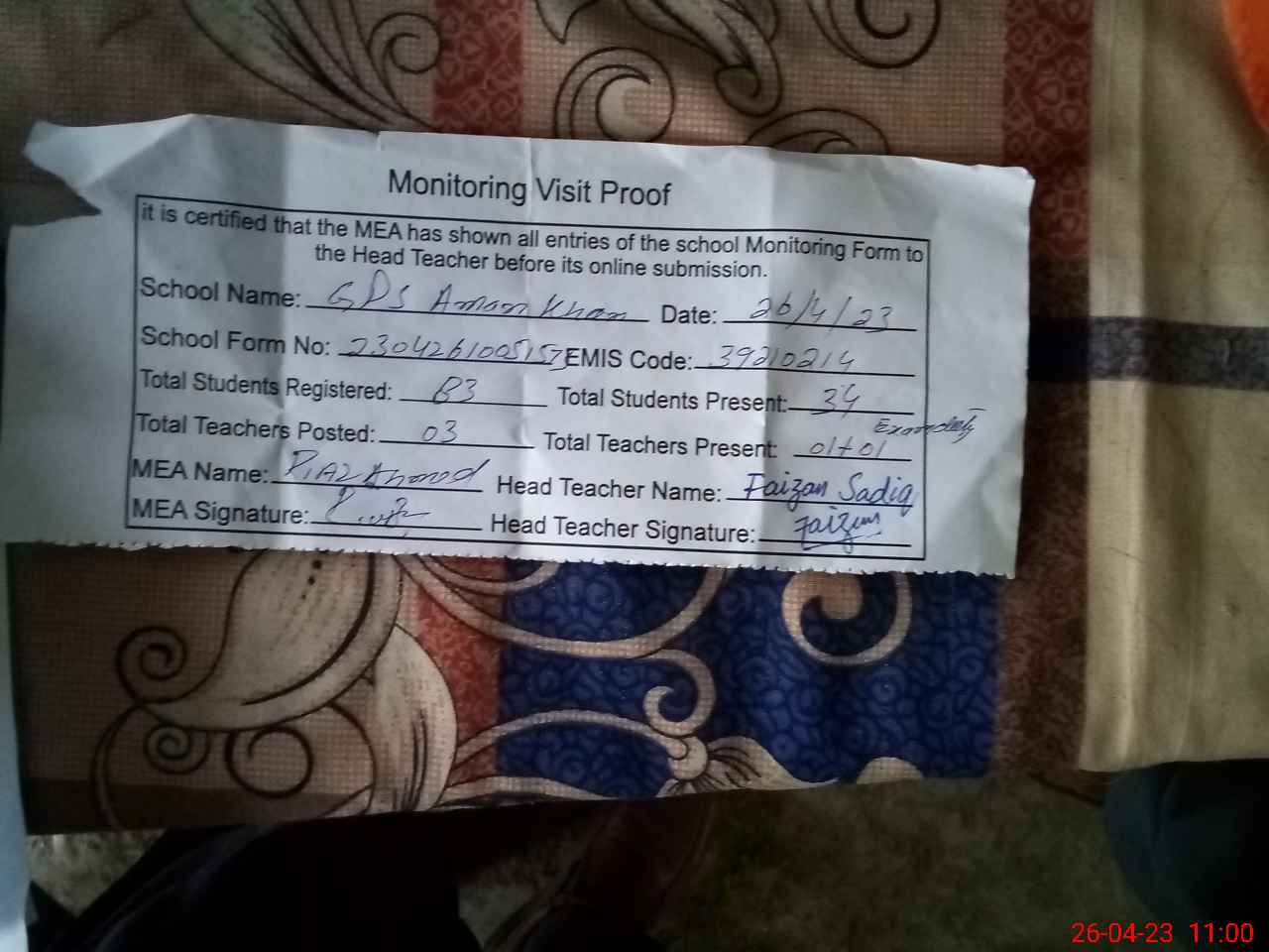 | Attendance Register | Head Teacher | MEA with School | Visit Proof |