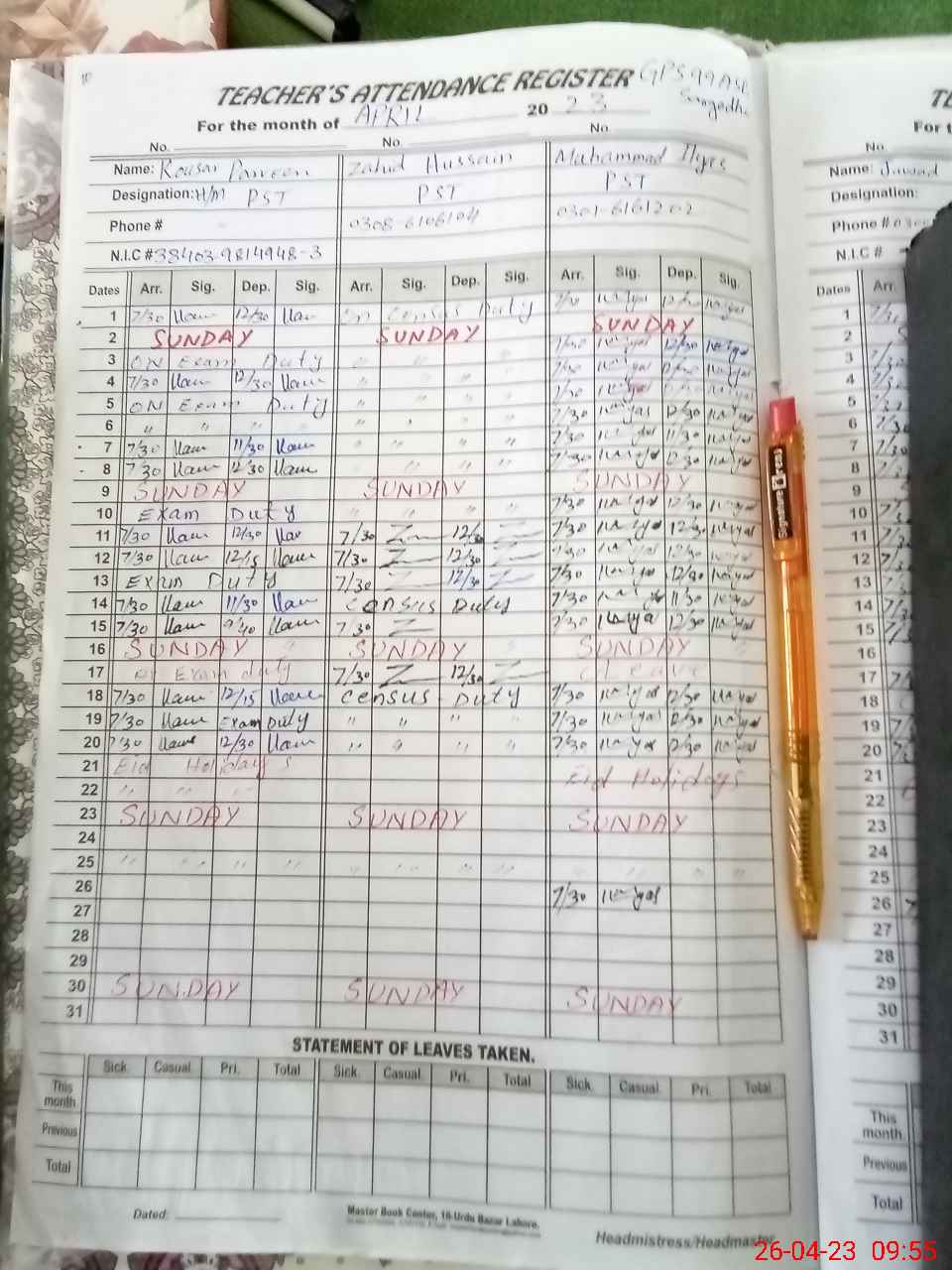 | 38**** | Ko**** Pa**** | PST | Regular | 0 | 0 | 0 | 0 | 0 | 0 | 0 | 0 | 0 | Exam Duty |
