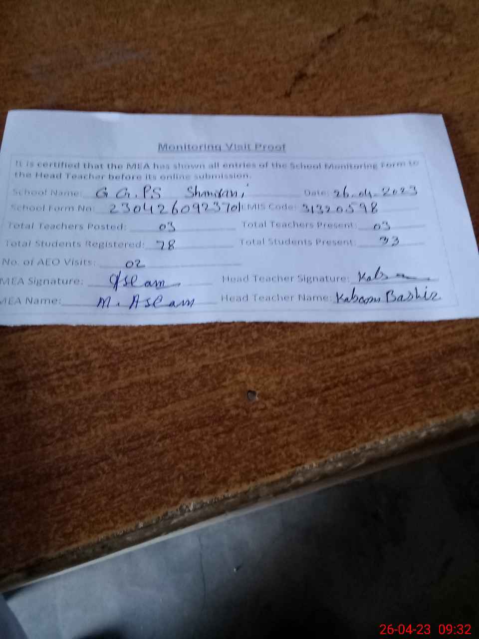 | Attendance Register | Head Teacher | MEA with School | Visit Proof |