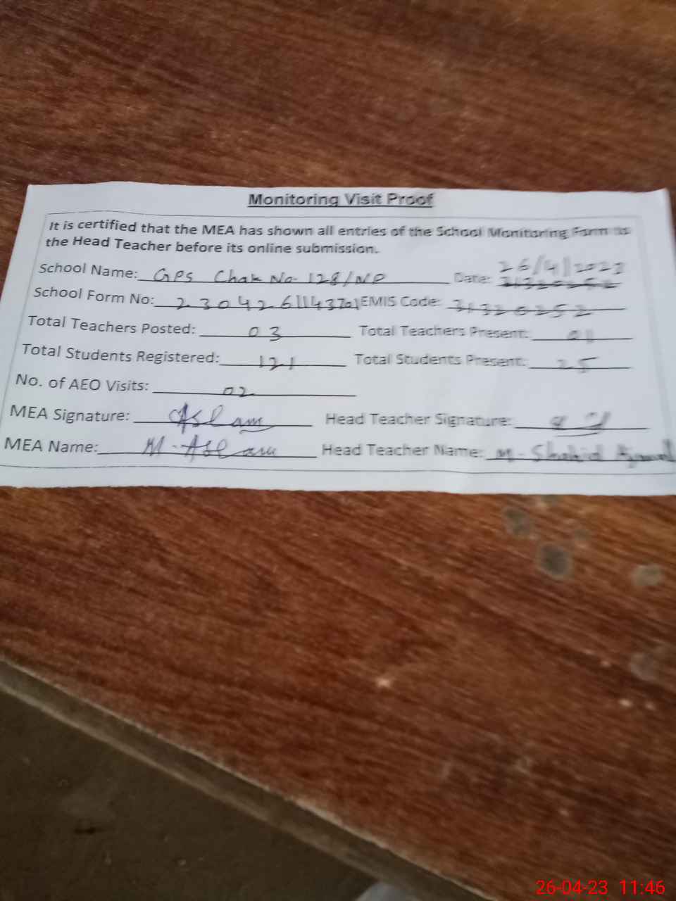 | Attendance Register | Head Teacher | MEA with School | Visit Proof |