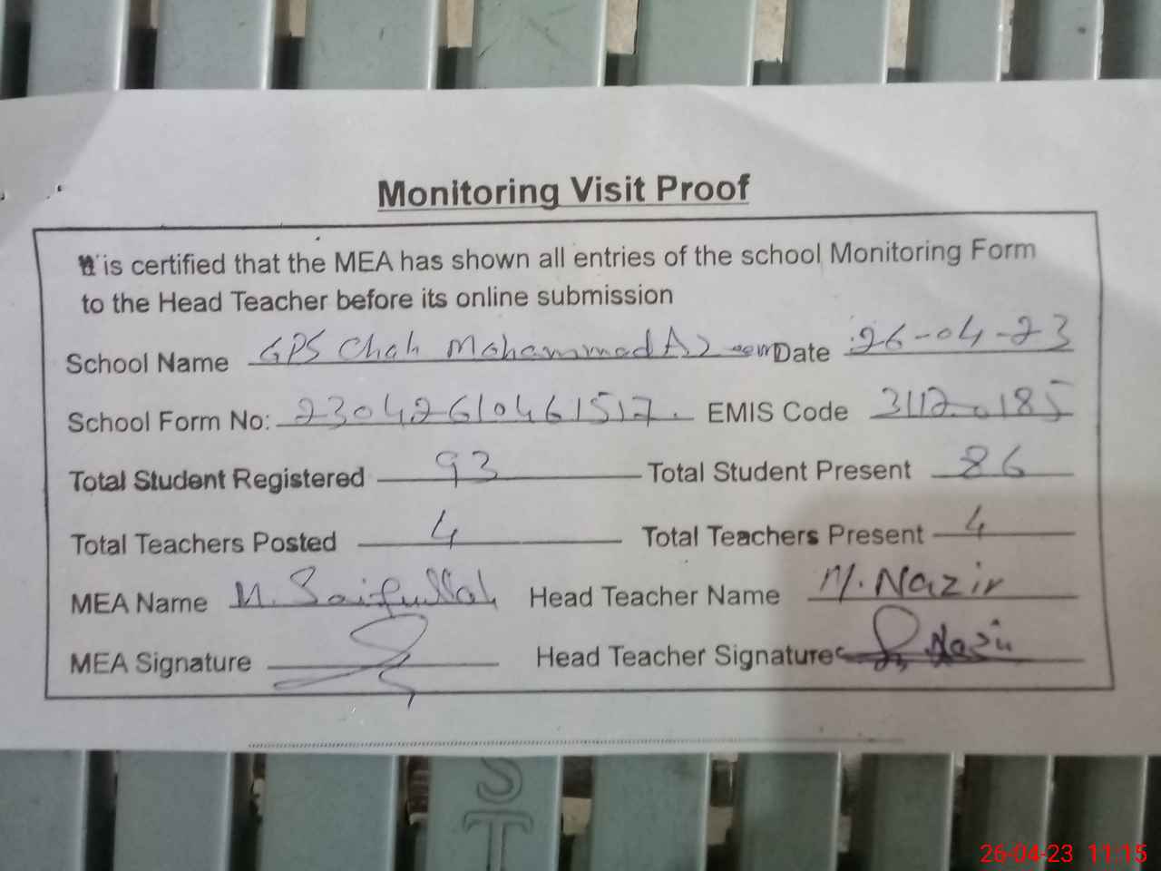 | EMIS Code: 31120185 | Name of School: GPS CHAH MUHAMMAD AZEEM | |||