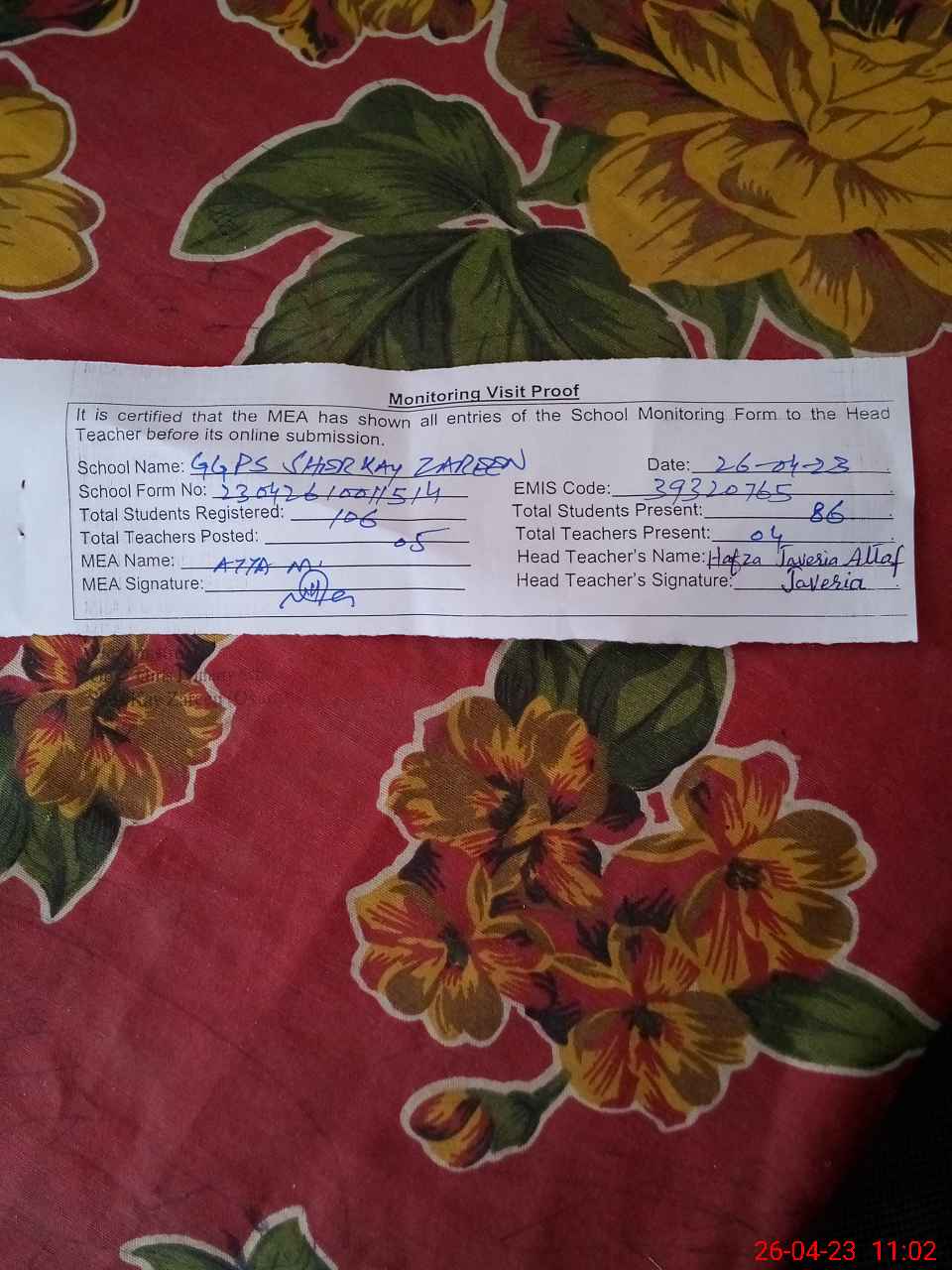 | Attendance Register | Head Teacher | MEA with School | Visit Proof |