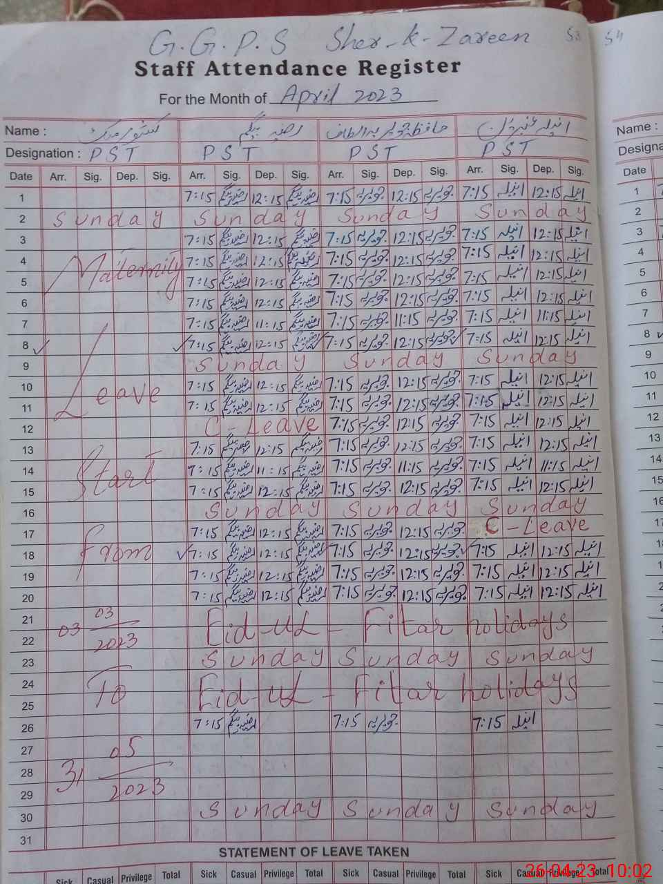 | Leave | Duty | Absent | Maternity | Medical | Ex- Pak |