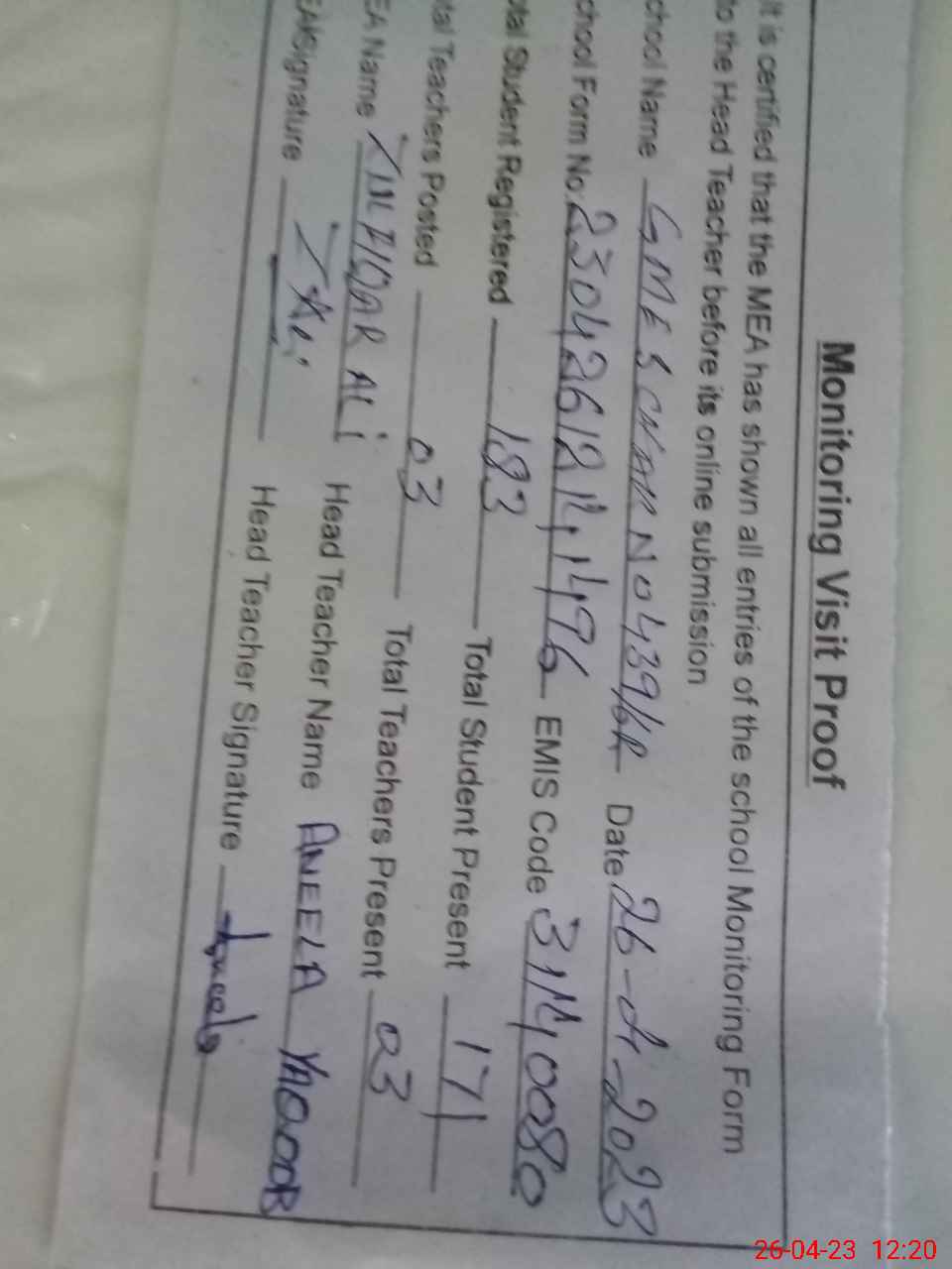 | Attendance Register | Head Teacher | MEA with School | Visit Proof |