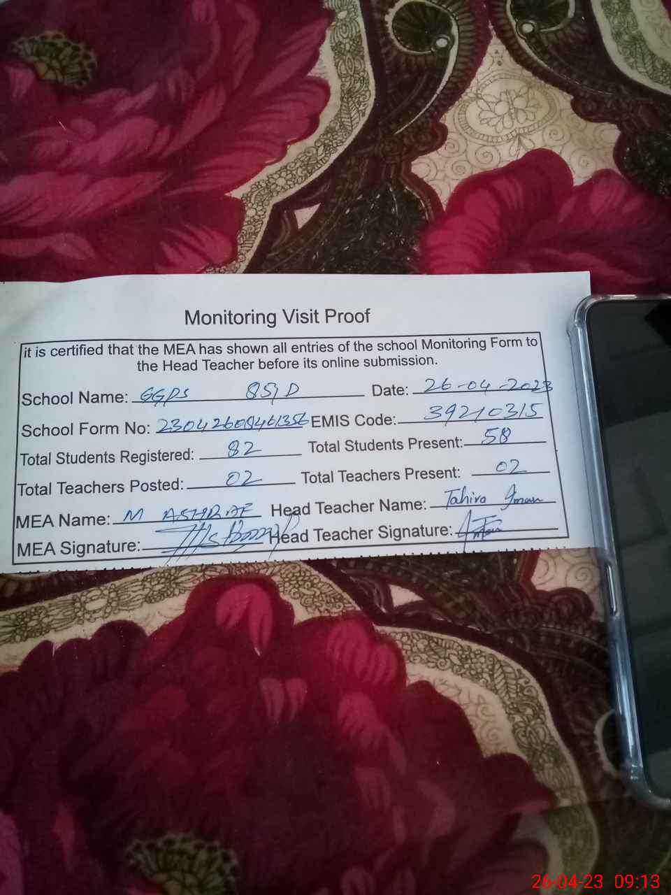 | Attendance Register | Head Teacher | MEA with School | Visit Proof |