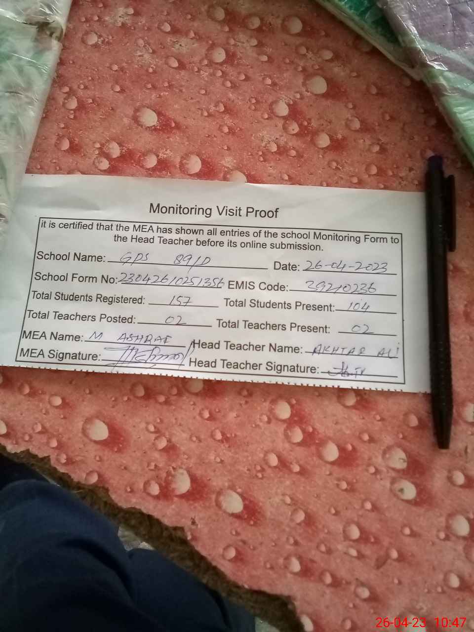 | Attendance Register | Head Teacher | MEA with School | Visit Proof |
