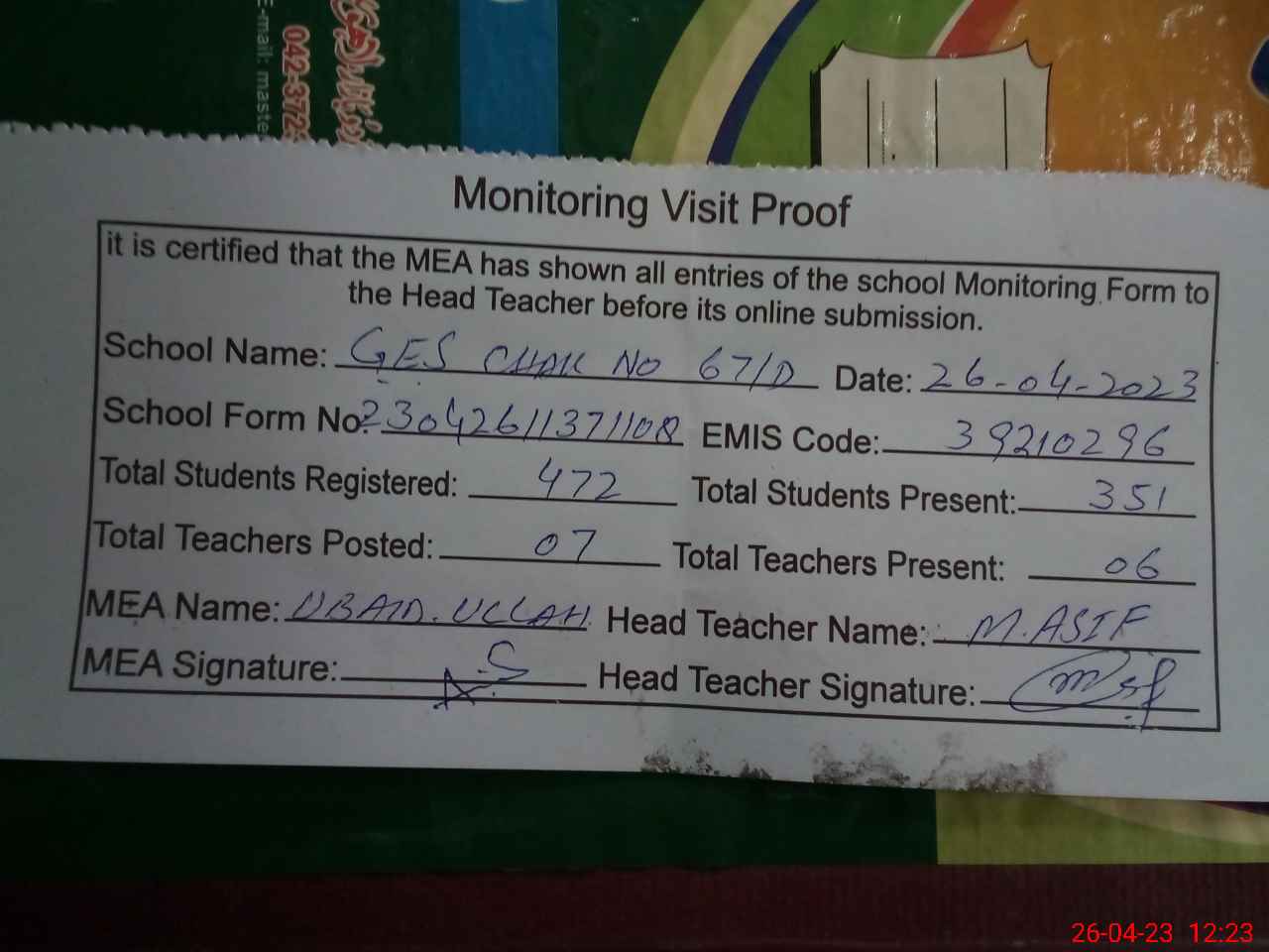 | Attendance Register | Head Teacher | MEA with School | Visit Proof |