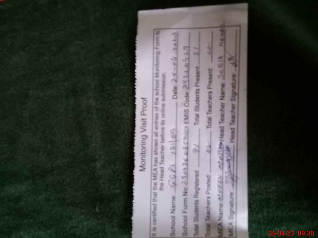 | Attendance Register | Head Teacher | MEA with School | Visit Proof |