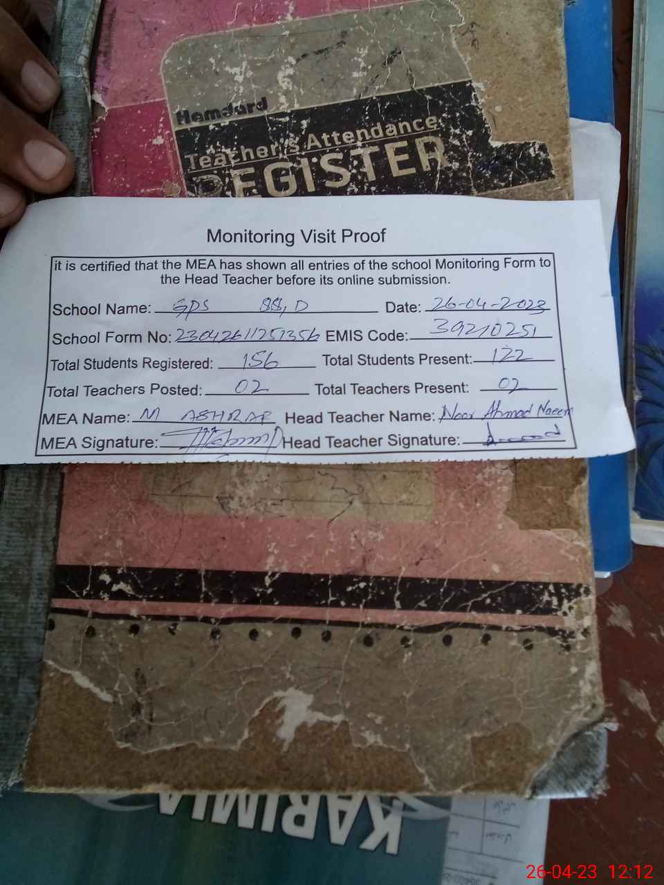| Attendance Register | Head Teacher | MEA with School | Visit Proof |